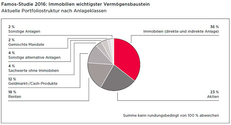 Die wichtigsten Ergebnisse der Studie: Immobilien bilden bei Family Offices die größte Anlageklasse im Gesamtvermögen. Der Anteil beträgt durchschnittlich 36 Prozent und hat sich gegenüber der Famos-Studie 2012 um einen Prozentpunkt erhöht. Die Aktienquote ist dagegen deutlicher gestiegen von 18 auf 23 Prozent. Wie zu erwarten ist der Rentenanteil im Gegenzug zurückgegangen – von 24 auf 18 Prozent.